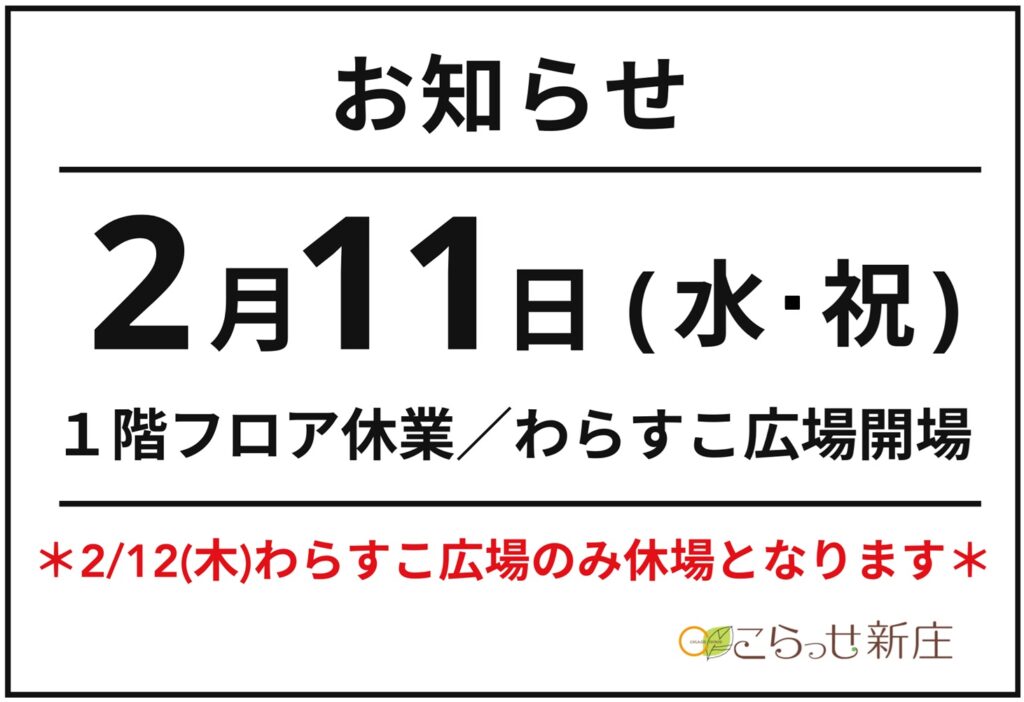 2月11日(水・祝)1階フロアは休業、4階わらすこ広場は開場いたします。